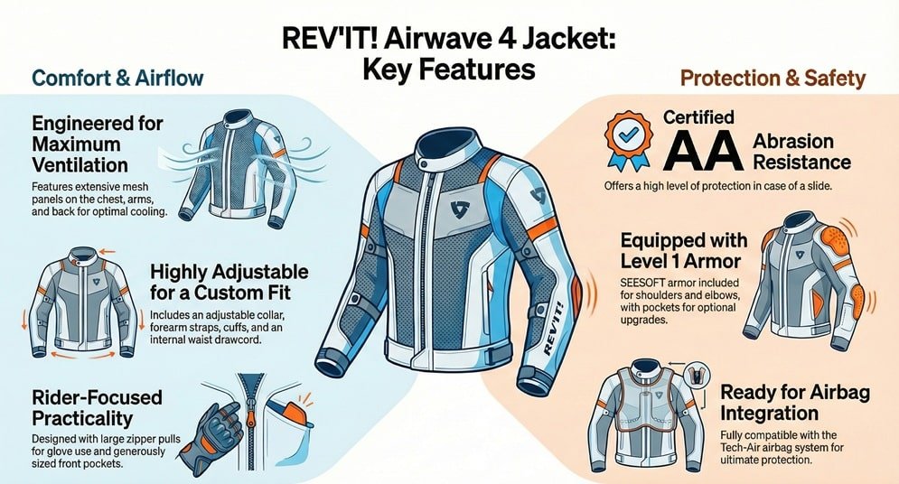 Our look at the REV’IT! Airwave 4 jacket places ventilation and rider safety in the spotlight for everyday motorcyclists. This textile outerwear is all about airflow—crafted with polyester ripstop, PWR|Shell mesh, and 3D air mesh panels that circulate air more effectively than virtually anything else in its category. I’ve worn the Airwave 4 consistently over five weeks of UK commuting and countryside outings, alternating it with numerous jackets I’ve tested across the past decade.